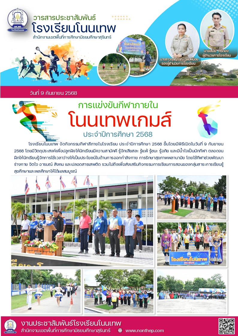 วันอังคารที่ 9 กันยายน 2568 โรงเรียนโนนเทพได้จัดกิจกรรมกีฬาสีภายในโรงเรียน ประจำปีการศึกษา 2568 ขึ้นเพื่อปลูกฝังให้นักเรียนมีความสามัคคี รู้จักเสียสละ รู้แพ้ รู้ชนะ รู้อภัย และมีน้ำใจเป็นนักกีฬา