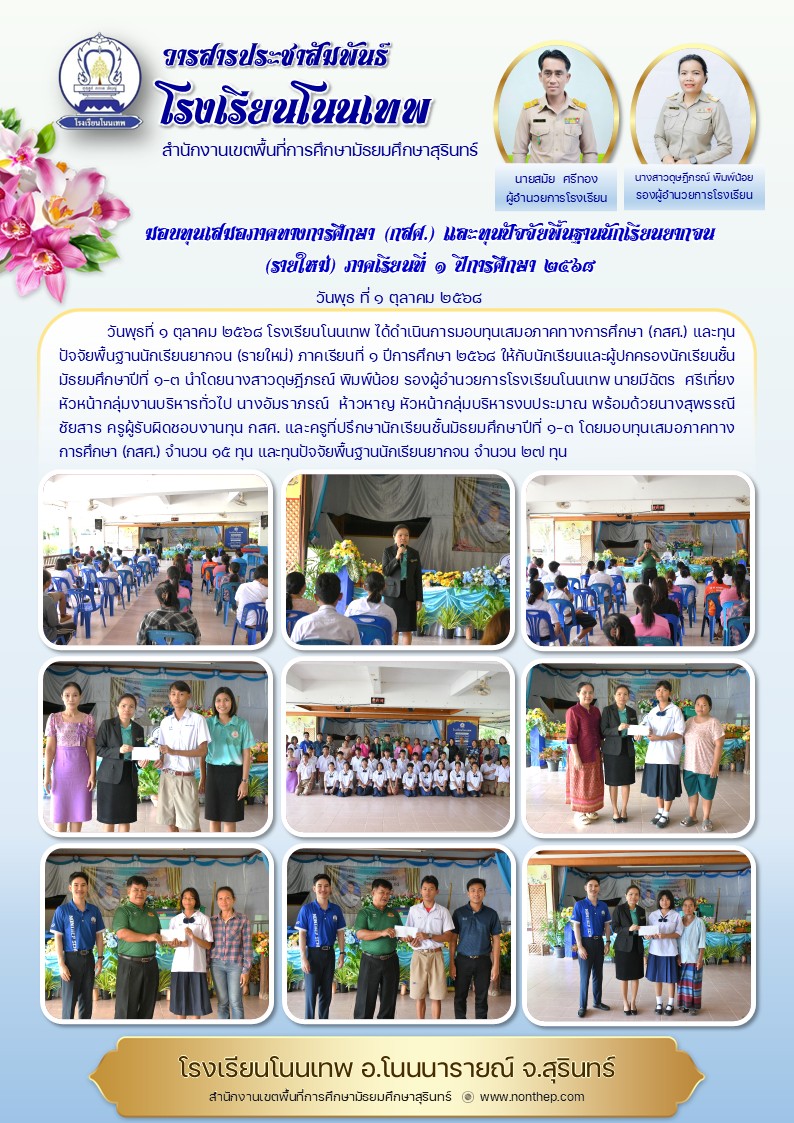 วันพุธที่ 1 ตุลาคม 2568 โรงเรียนโนนเทพมอบทุนเสมอภาคทางการศึกษา (กสศ.) และทุนปัจจัยพื้นฐานนักเรียนยากจน (รายใหม่) นักเรียนชั้น ม.1-3 ภาคเรียนที่ ๑ ปีการศึกษา ๒๕๖๘
