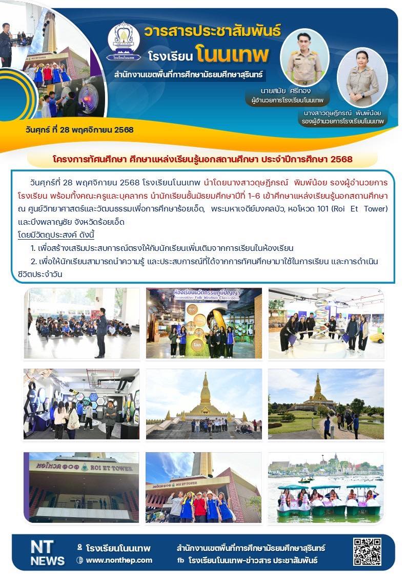 วันศุกร์ที่ 28 พฤศจิกายน 2568 โรงเรียนโนนเทพได้ดำเนินการตามโครงการทัศนศึกษา ประจำปีการศึกษา 2568 โดยนำนักเรียนชั้นมัธยมศึกษาปีที่ 1-6 ไปศึกษาแหล่งเรียนรู้นอกสถานศึกษา ณ จังหวัดร้อยเอ็ด