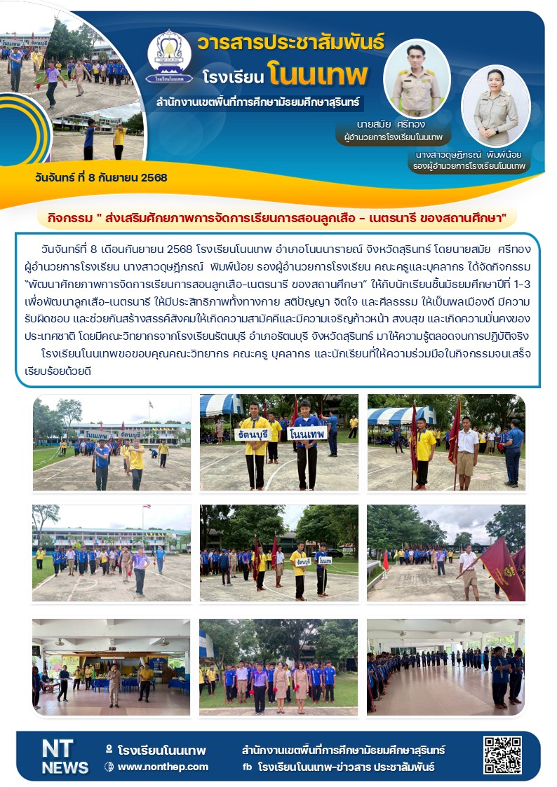 วันจันทร์ที่ 8 เดือนกันยายน 2568 โรงเรียนโนนเทพ จัดกิจกรรม “พัฒนาศักยภาพการจัดการเรียนการสอนลูกเสือ-เนตรนารี ของสถานศึกษา” ให้กับนักเรียนชั้นมัธยมศึกษาปีที่ 1-3 โดยมีคณะวิทยากรจากโรงเรียนรัตนบุรี มาให้ความรู้ตลอดจนการปฏิบัติจริง