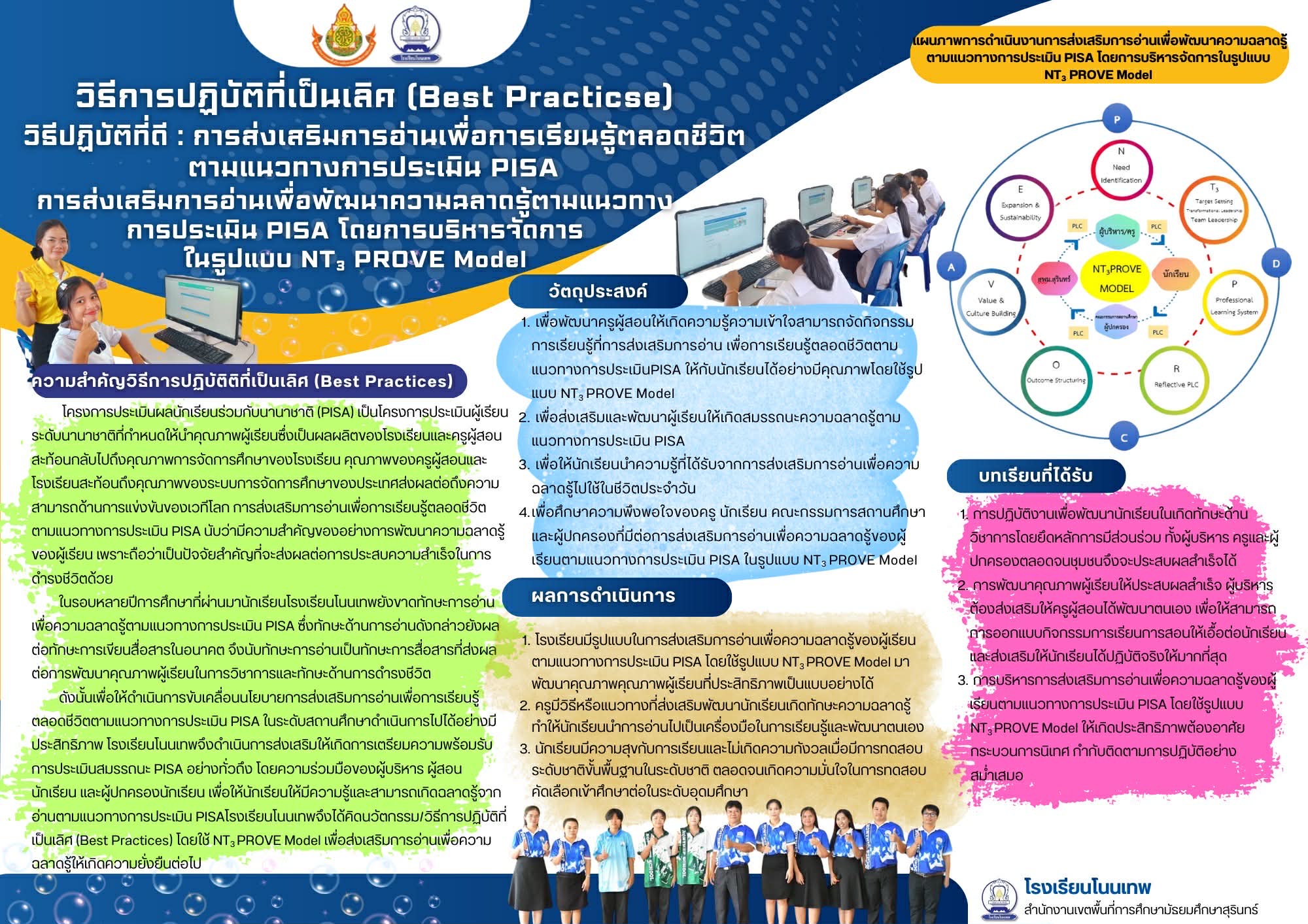 รงเรียนโนนเทพขอเผยแพร่นวัตกรรมและวิธีปฏิบัติที่เป็นเลิศ (Best Practice) เรื่อง “การส่งเสริมการอ่านเพื่อพัฒนาความฉลาดรู้ตามแนวทางการประเมิน PISA โดยใช้รูปแบบ NT3 PROVE MODEL”