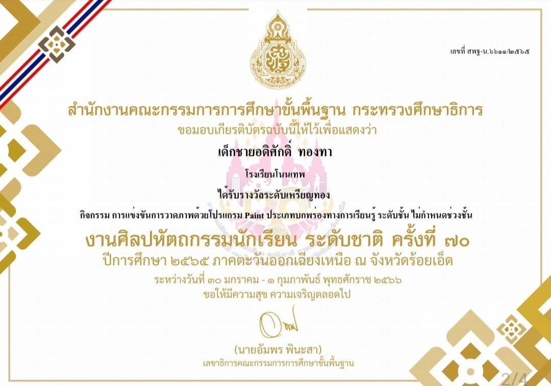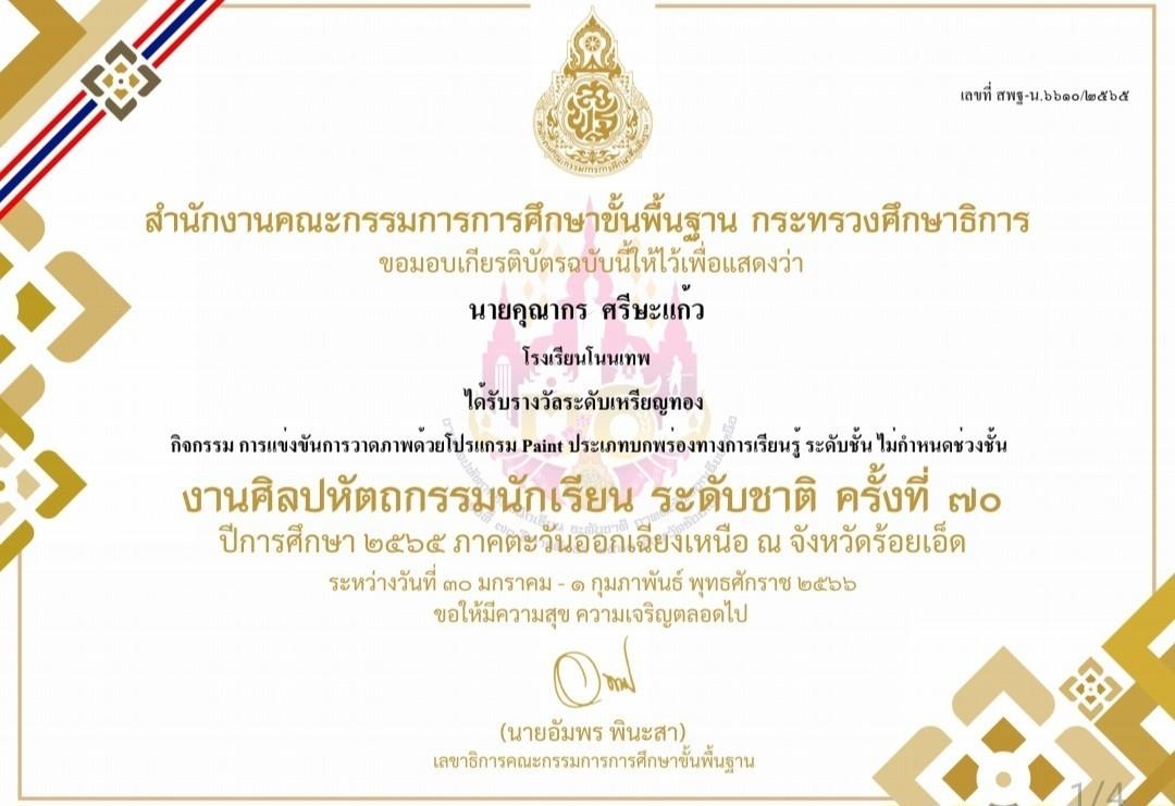 เหรียญทอง การแข่งขันการวาดภาพด้วยโปรแกรม Paint ประเภทบกพร่องทางการเรียนรู้ ไม่กำหนดช่วงชั้น ม.1-ม.6