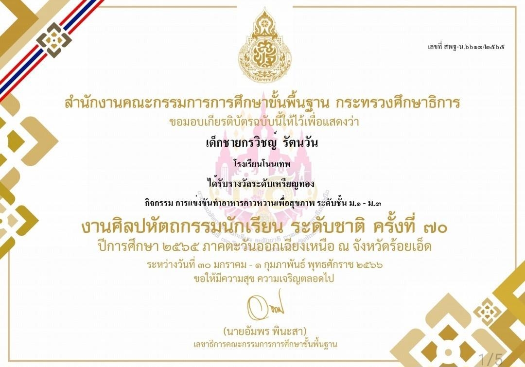 เหรียญทอง การแข่งขันทำอาหารคาวหวานเพื่อสุขภาพ [ม.1-ม.3]
