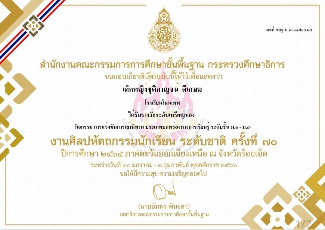 เหรียญทอง การแข่งขันการเล่านิทาน ประเภทบกพร่องทางการเรียนรู้ [ม.1-ม.3]
