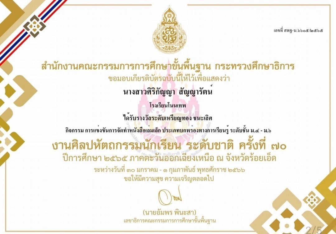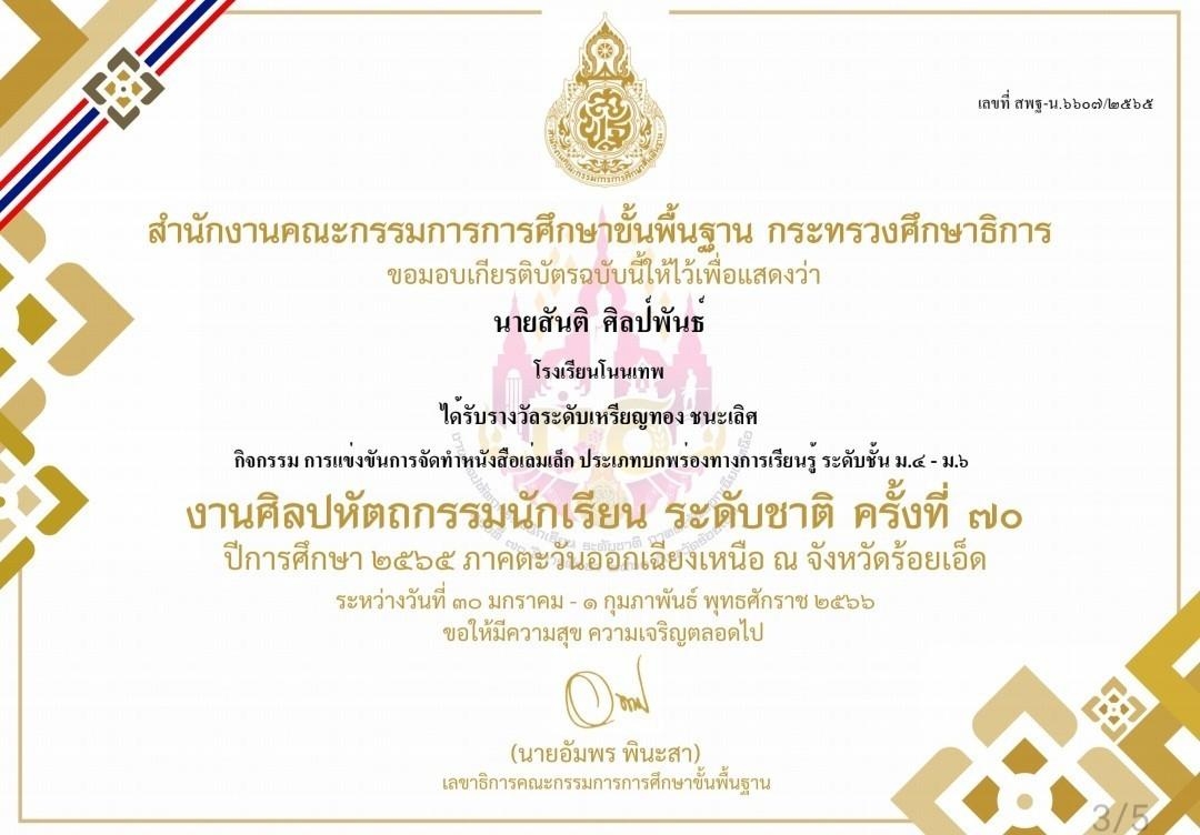เหรียญทอง ชนะเลิศ กิจกรรม การแข่งขันการจัดทำหนังสือเล่มเล็ก ประเภท บกพร่องทางการเรียนรู้ ระดับชั้น ม.4-ม.6
