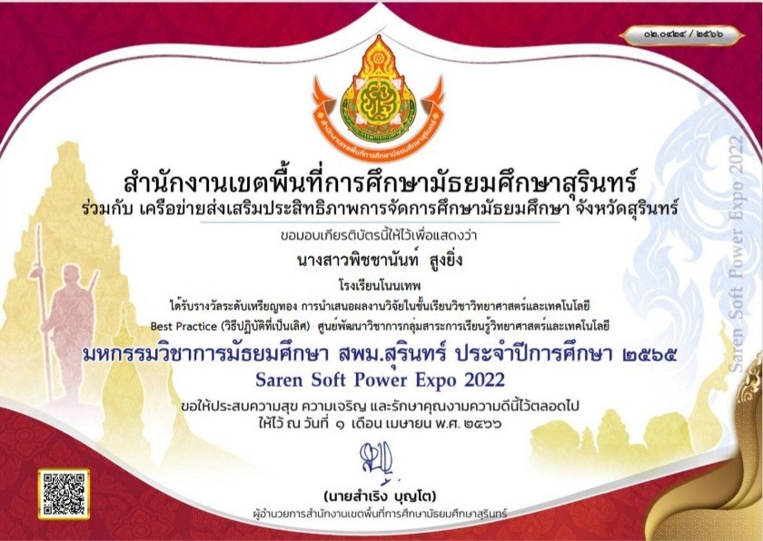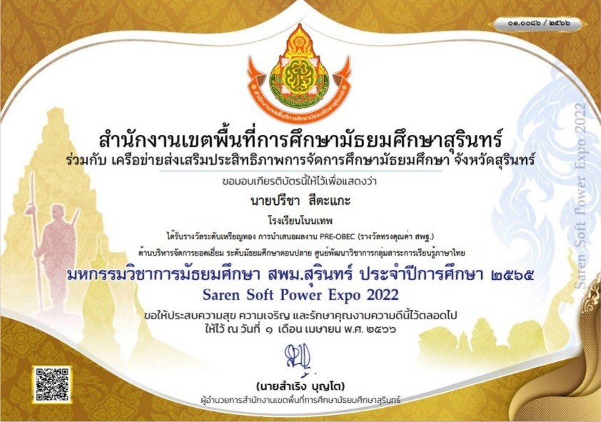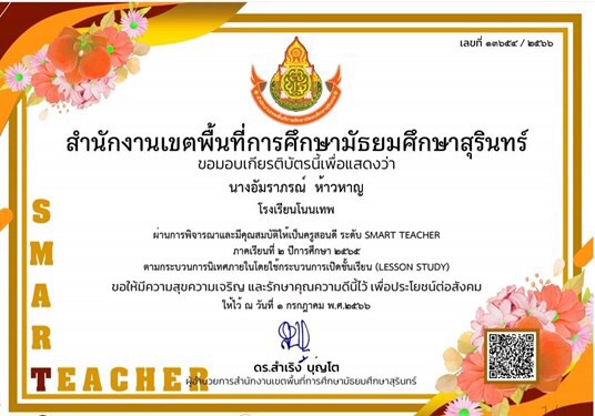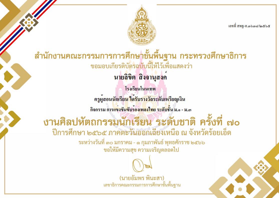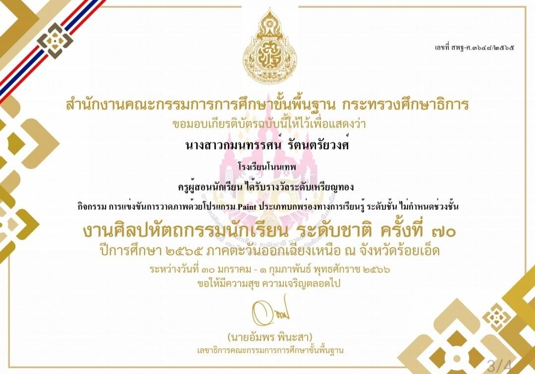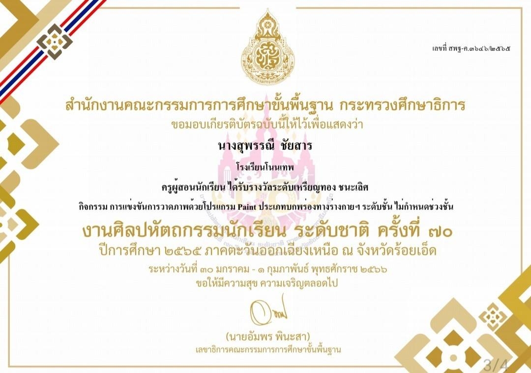 ครูผู้สอนนักเรียนได้รับรางวัล เหรียญทอง การแข่งขันการวาดภาพด้วยโปรแกรม Paint ประเภทบกพร่องทางการเรียนรู้ ไม่กำหนด ช่วงชั้น ม.1-ม.6 |