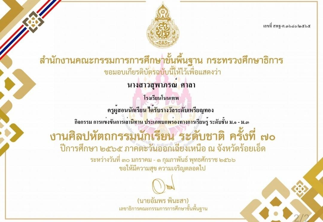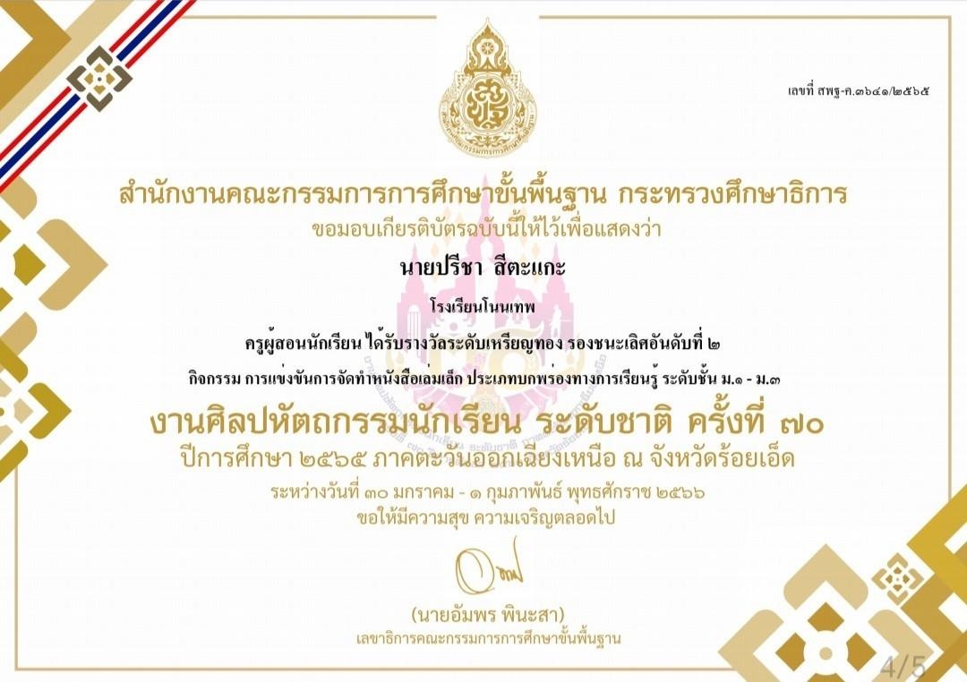 ครูผู้สอนนักเรียนได้รับรางวัล รองชนะเลิศ อันดับ 2 กิจกรรม การแข่งขันการจัดทำหนังสือเล่มเล็ก ประเภท บกพร่องทางการเรียนรู้ ระดับชั้น ม.1-ม.3 |